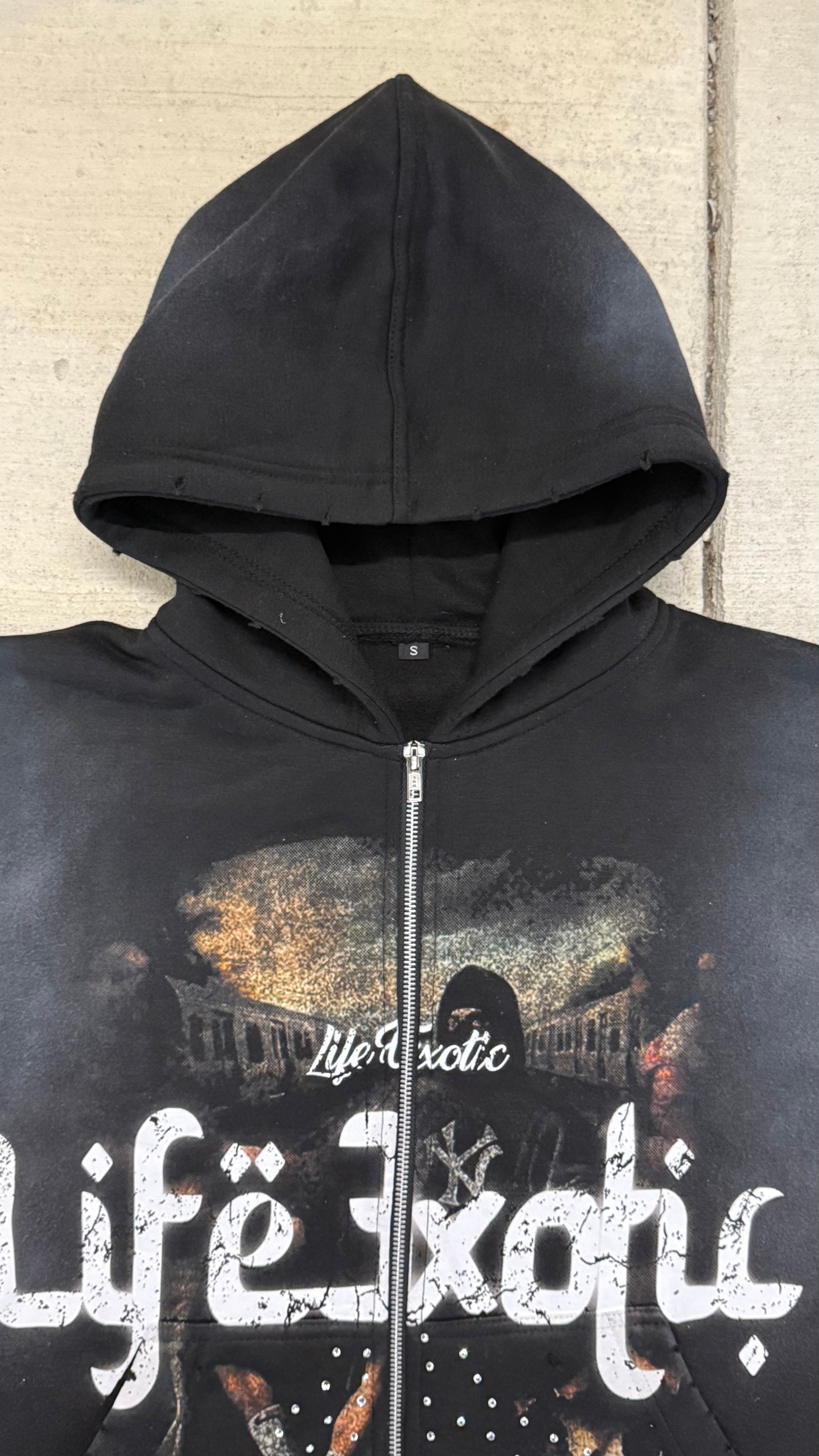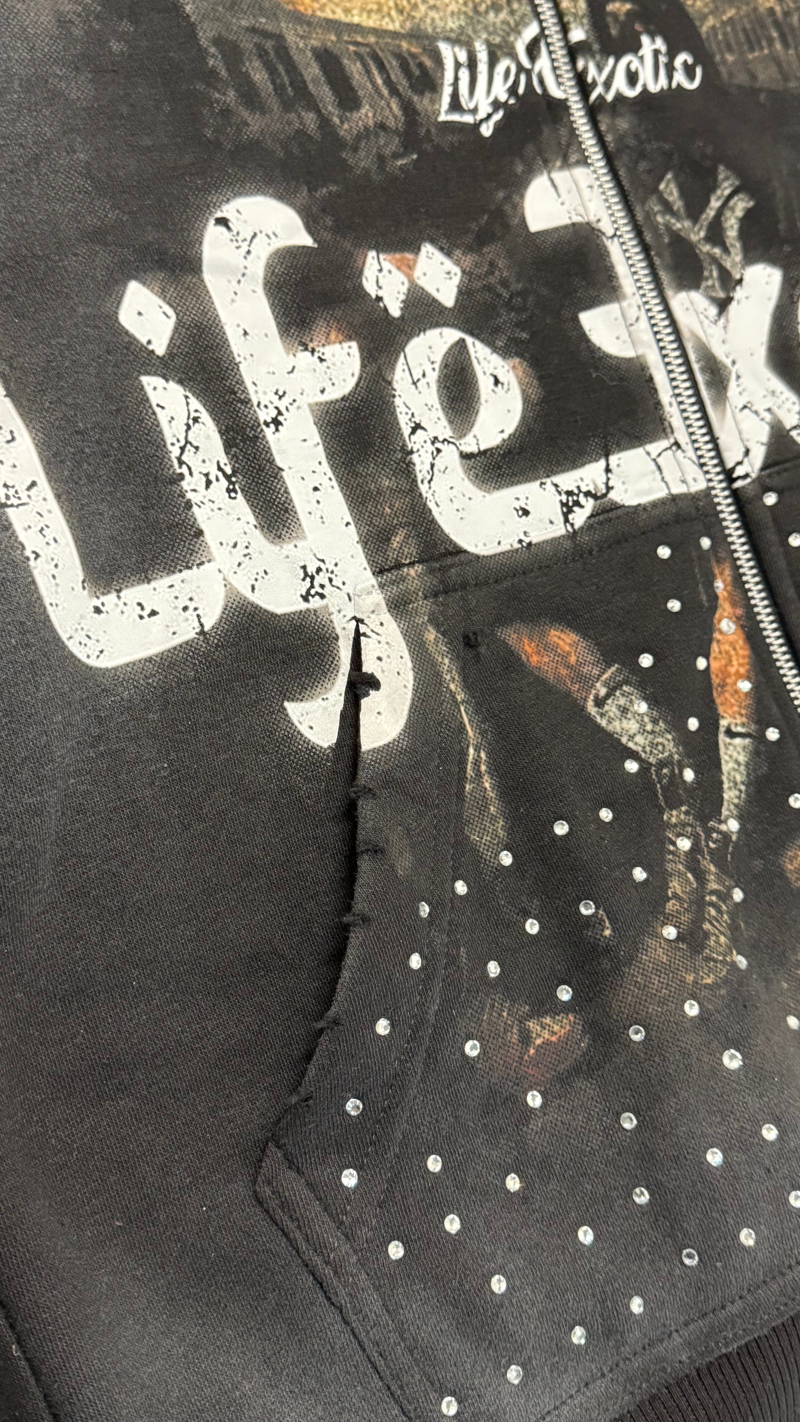 - Distressed On Hood & Pockets